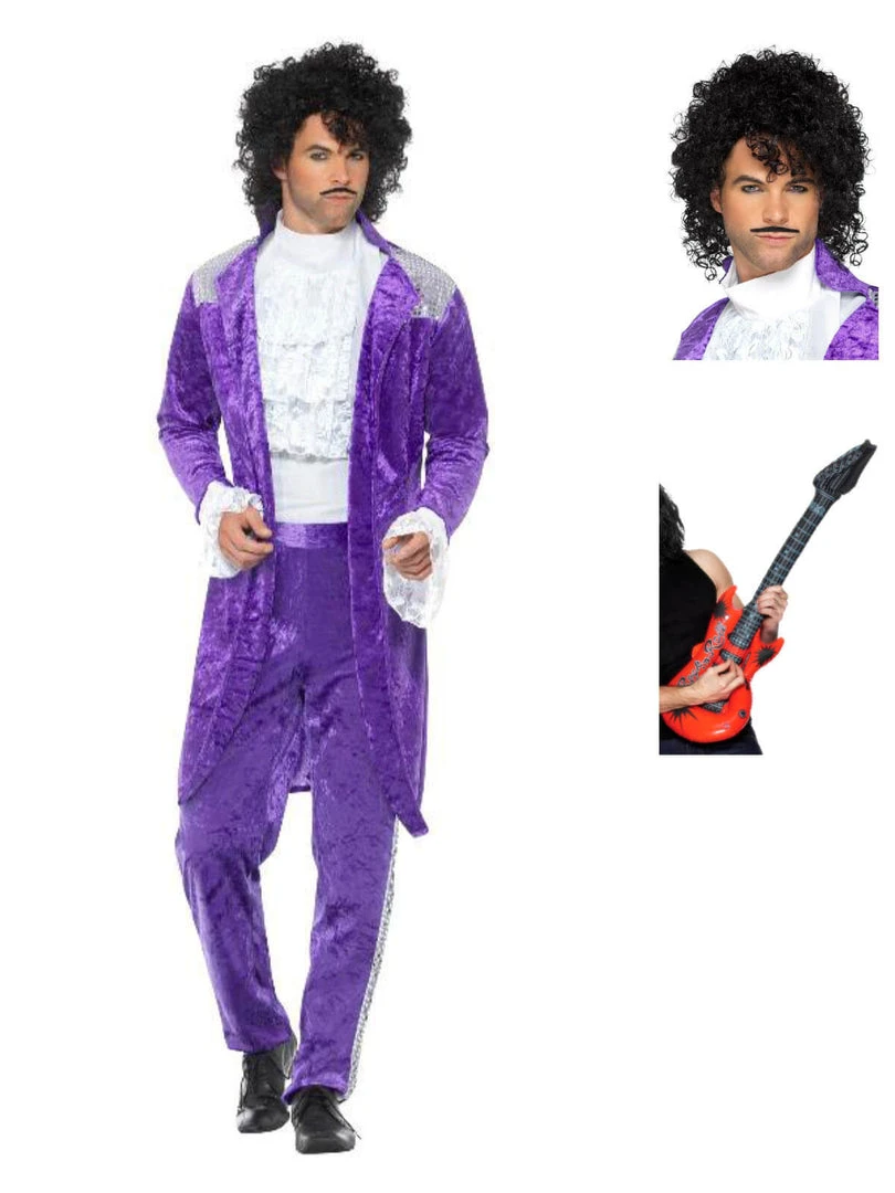 You’ll look the part in this 80’s Purple Musician Costume. An original alternitive to an 80’s look. Costume comes with purple velvet like jacket, Mock Shirt & Trousers. Complete the look with an inflatable guitar!