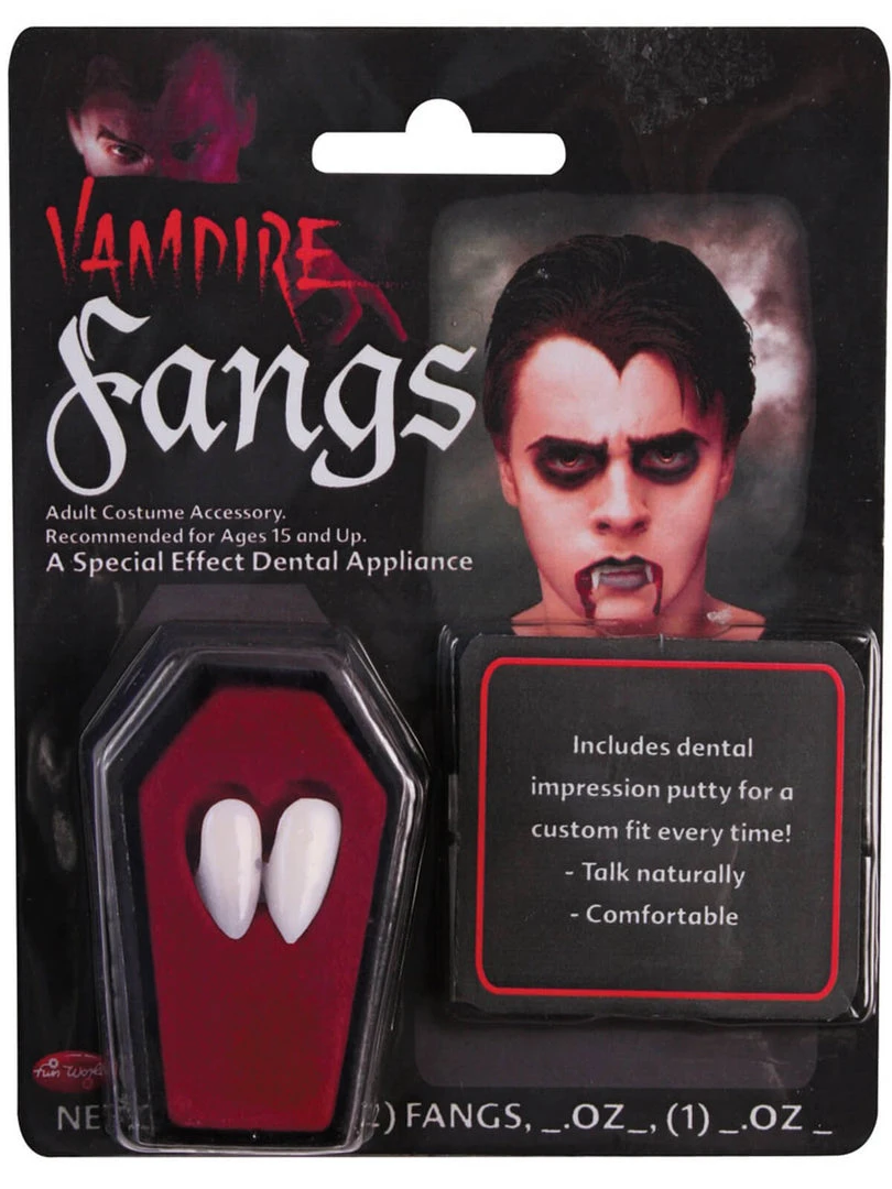 MAKE BLOOD NOT WAR! with these Vampire horror teeth. These prosthetic teeth stick with adhesive putty & are comfortable to wear.