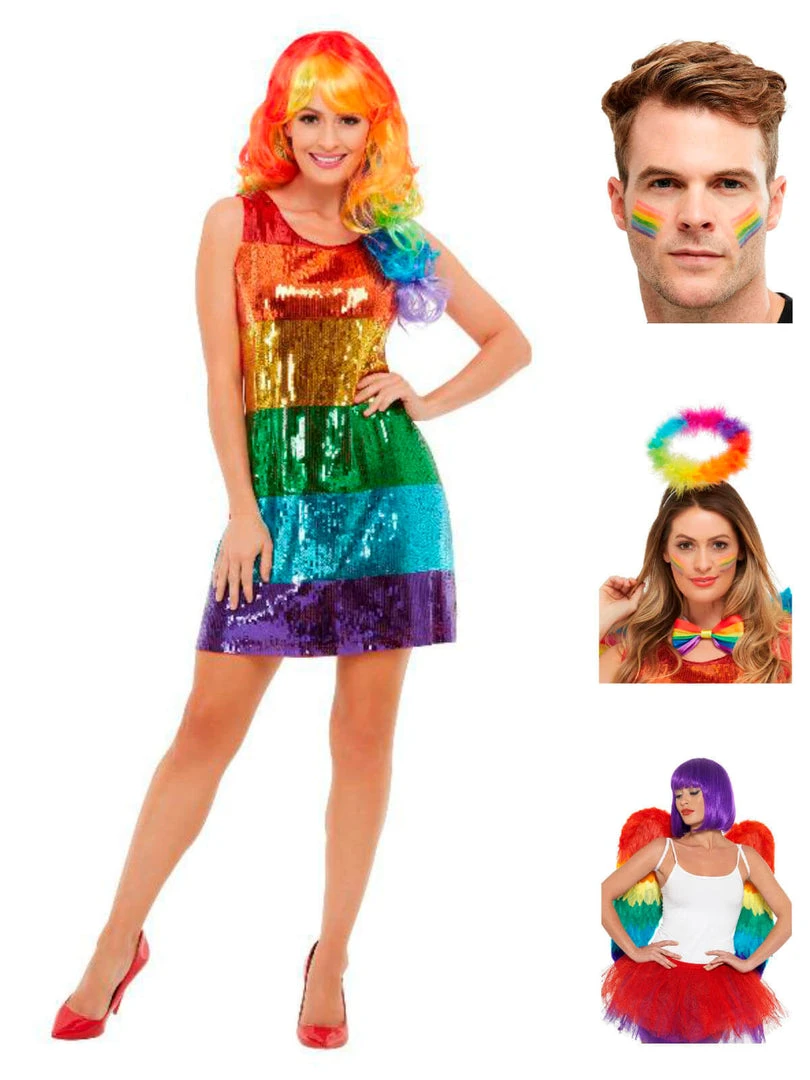 Be the sparkliest rainbow at the party in this gorgeous sequin rainbow dress. A great Festival look or Pride costume.