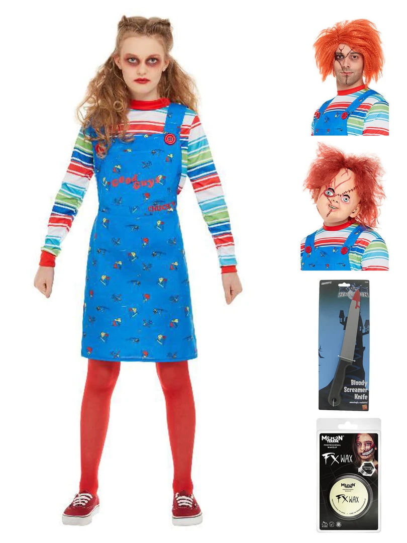 You’re kid will WANNA PLAY in this Chucky costume! Complete with printed blue dungarees dress and striped top, creaping people out will be Childs Play! Finish the look with a chucky wig and some face paint.