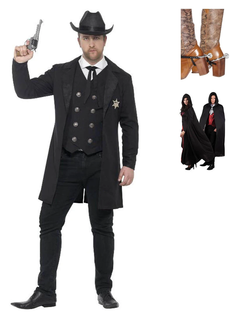 Curves Sheriff Costume, Black, with Jacket, Waistcoat, Neck Tie & Hat