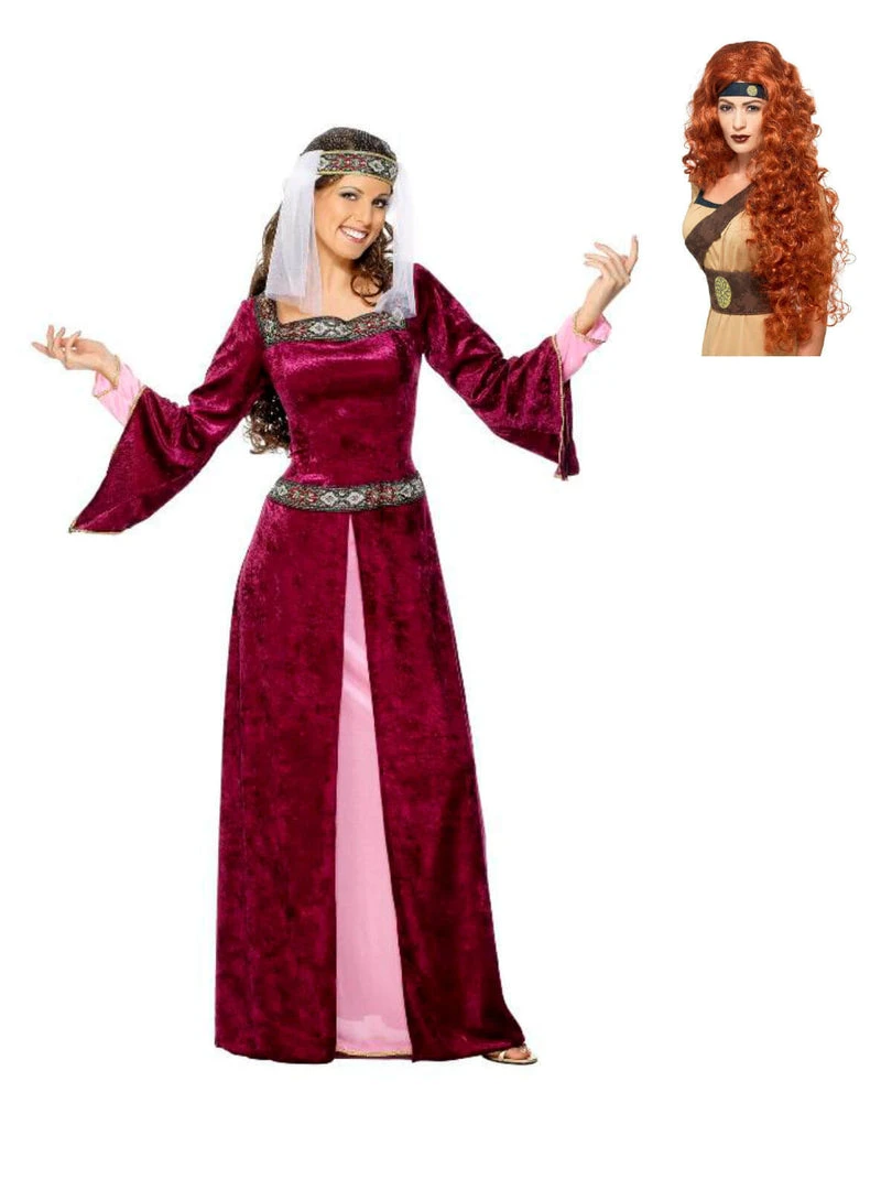 Ride though the glen with Robin Hood in this Maid Marrion fancy dress costume! This gorgeous long burgundy dress has Wizard sleves and a head piece.