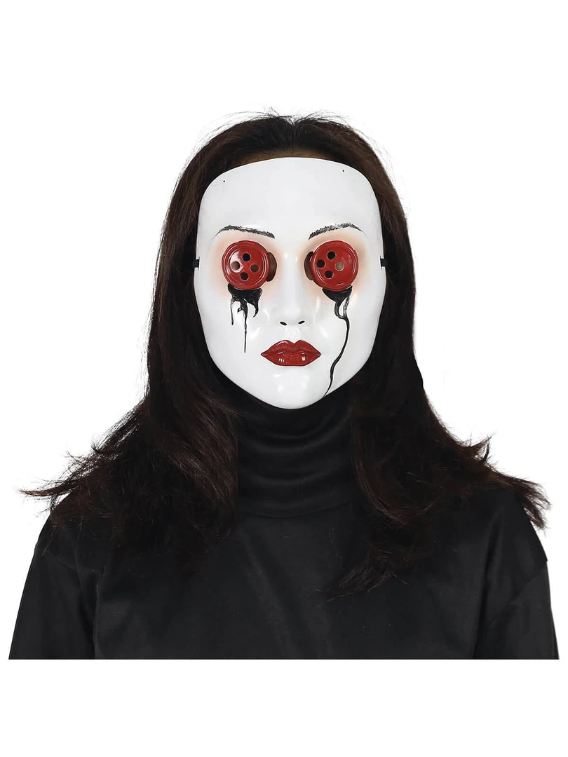 This Buttoned up mask is an anonymously creepy girl with bleeding button eyes. A great Halloween mask.