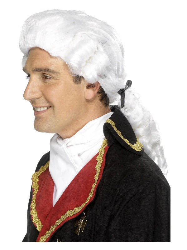 ALL RISE! Play the part of the leader in this court wig. This long white wig comes with ribbons and curls.