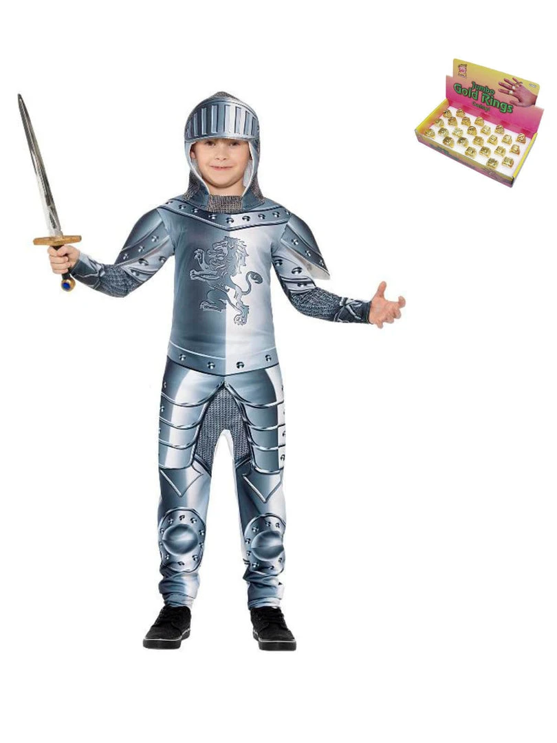 Boys will love dressing up as a knight for Halloween, World book day or any day they are looking to save their princess. This deluxe knight costume comes with a grey digital printed Jumpsuit & Headpiece.