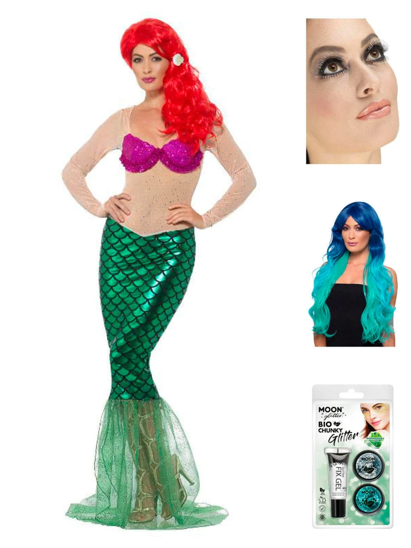 This full lenth Mermaid dress costume comes complete with skin coloured bodice, bright pink bra cups and beautiful green sequin skirt. You’ll be singing ‘Under The Sea’ in no time!