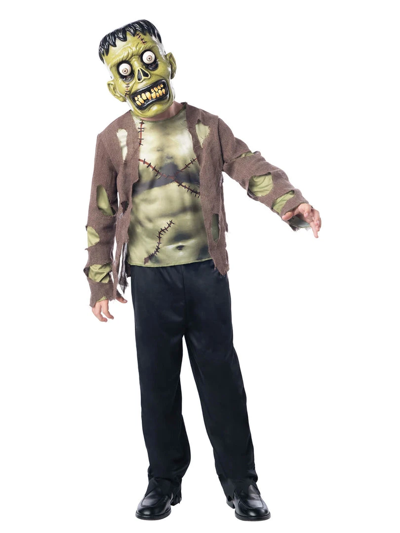 HE’S ALIVE! This Franken costume includes Shirt with attached jacket and a mask with googly eyes!