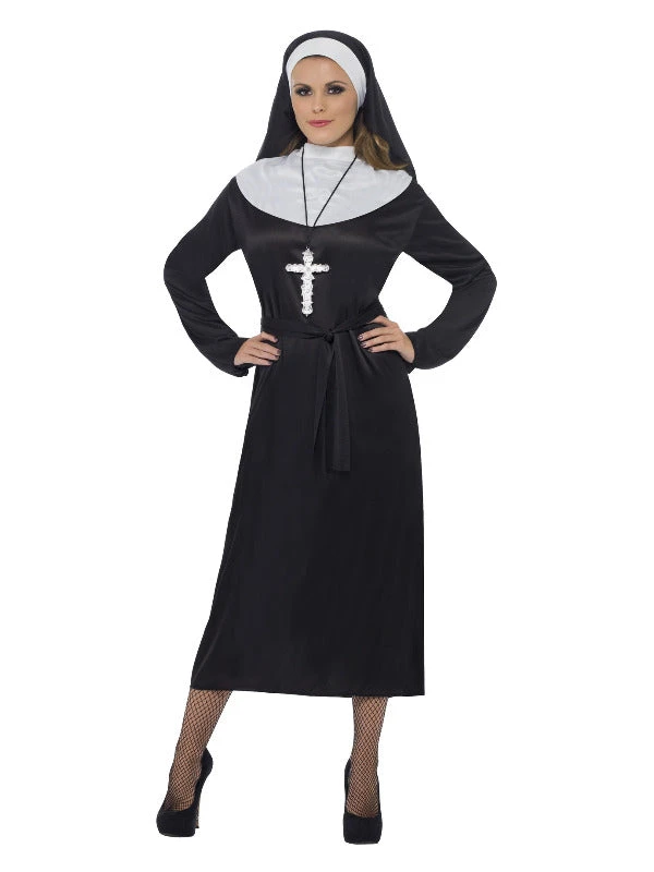 Be holier then thou in this Nun costume. Comes complete with Black dress, belt and headdress. Complete the look with a cross pendant and plenty of red wine!