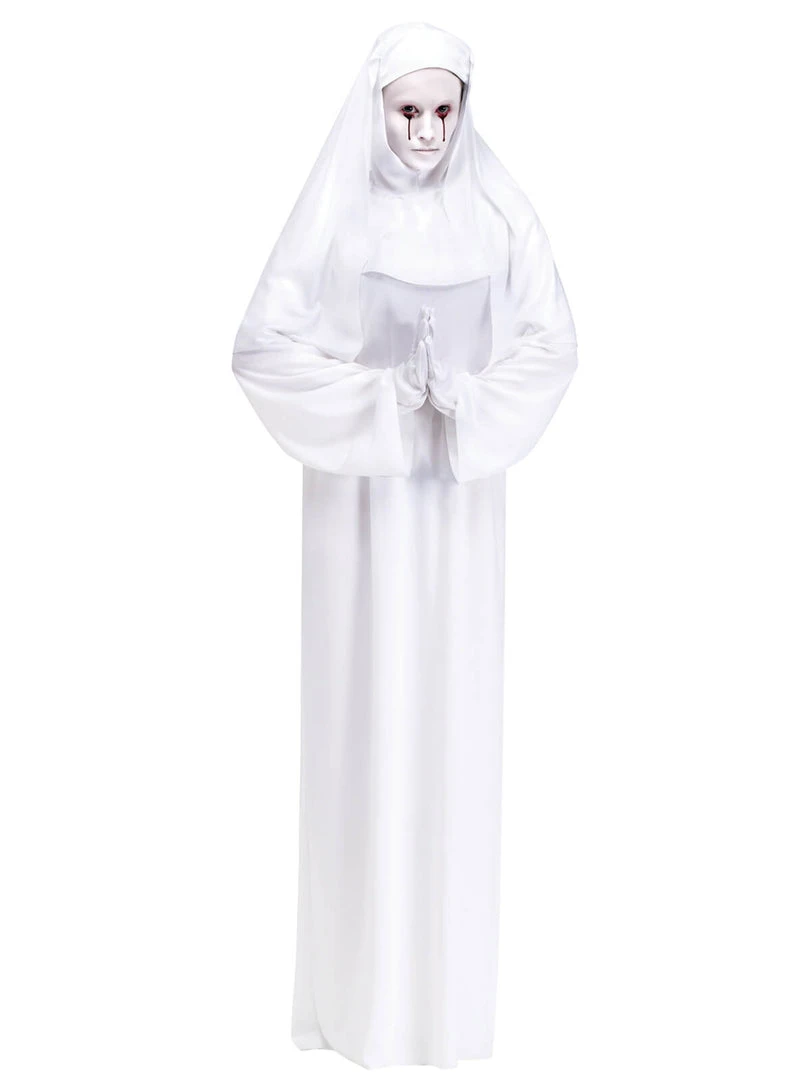 Strke fear into the hearts of all who cross your path in this terrifying haunted nun costume. Add facepaint and contacts to really up the fear factor.