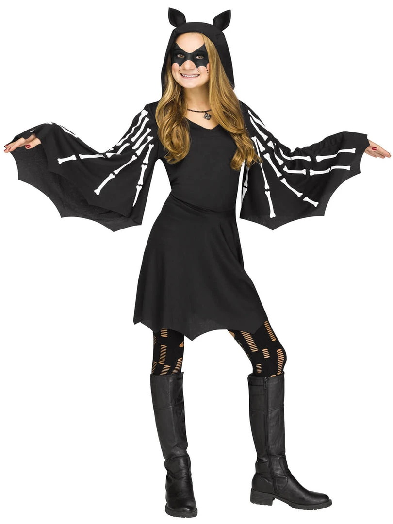 Turn your kid into a little bloodsucker in this Vampire bat costume. The costume includes a Hooded Dress with a Skeleton wing print on sleeves. A great one to have in your dress-up box.