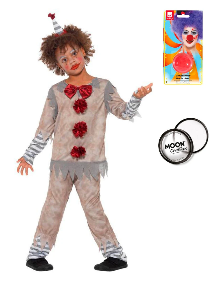 Bring out the old or the evil in this vintage Clown boy costume. Comes complete with grey and red top, trousers & headband.